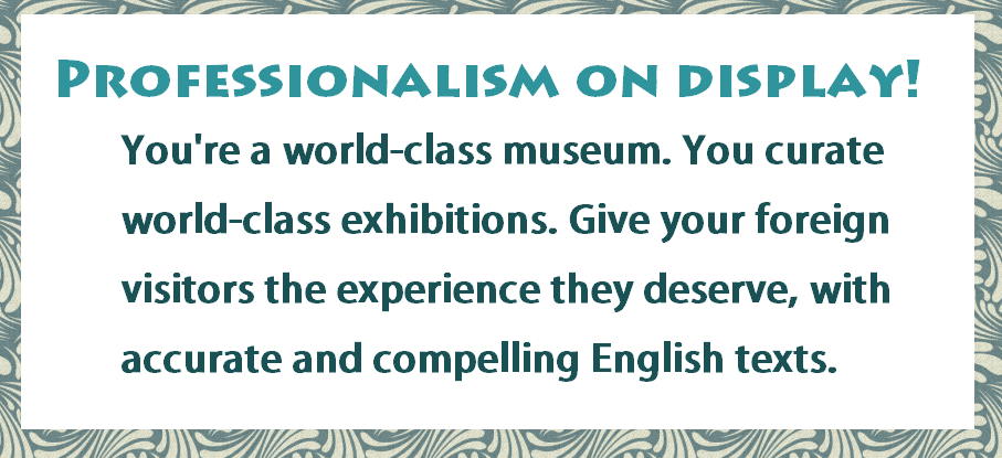 Your exhibition attracts thousands of visitors from outside the country. How many of them speak your language? Artwork captions, exhibition brochures, advertising materials — they’re not even telling half the story if they aren’t available in clear, mistake-free English. Don’t let the quality of your show or your institution be brought down by grammatical, typographical, and usage errors. Perhaps you neglect English-language texts altogether, simply because you don’t have qualified staff on-site? You want to communicate more effectively with your overseas donors and patrons? You’ve come to the right place!