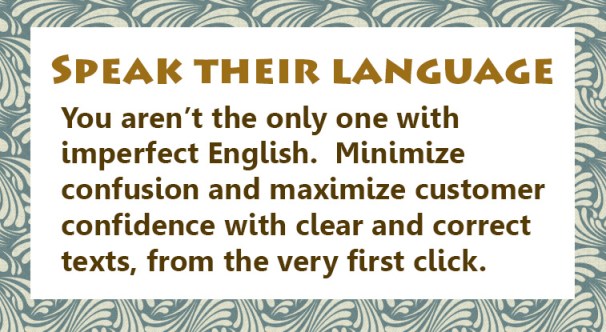 But native English speakers aren’t the only issue. You are communicating with nearly every customer outside of your country with your English-language offerings. The more errors and oddities in your texts, the more difficulty these sensitive users will have understanding the basic meaning of your message.
